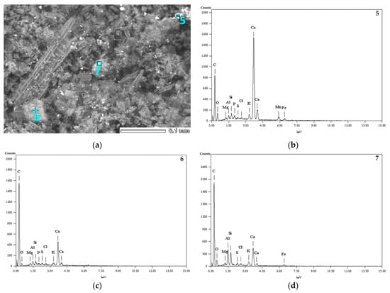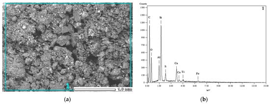 For each sample, a collective analysis of the EDS mineral composition and a point analysis were performed to identify additional mineral phases present in the tested samples. The analysis results for the brown coal sample show that it contained calcite, quartz, gypsum and trace amounts of sulfur, silica, feldspar and clay minerals (Figure 2 and Figure 3).