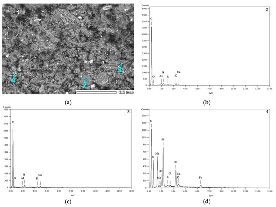 The spectrum of the activated carbon sample indicates that it was almost pure carbon. There were slight traces of silica, feldspar, clay minerals and calcite (Figure 4, Figure 5 and Figure 6). The X-ray spectra for points 2, 3 and 4 of the samples of brown coal (Figure 3b–d) confirm the high content of silica in its structure in the general spectrum (Figure 2b), where the percentage of silica ranges from 40 to 50% relative to the highest value. It is also worth noting that at points 3 and 4 (Figure 3b–d), aluminum (0.6–47% relative to the highest value) and calcium (2–58% relative to the highest value) appear, which are not detected in high amounts in the general spectrum (Figure 2b). Additionally, a characteristic feature of brown coal in the X-ray spectrum is the presence of trace amounts of titanium, which is not evident in activated carbon.