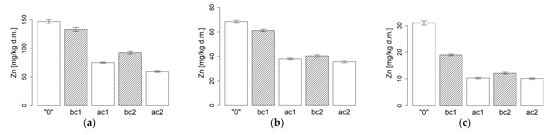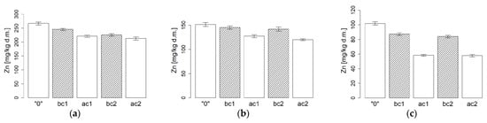 For single extractions, a DTPA solution was also used. This is a more aggressive reagent compared with the 1 M NH4NO3 solution and is often used to assess the potential solubility and bioavailability of metals [,,,,,,]. Research has shown that the DTPA solution extracts more of the total contents of metal forms than forms that are actually available to plants. Alloway [] indicated that these forms may change into actually available forms under conditions such as lower pH values. Based on the results obtained in the present study, the DTPA solution extracted the largest number of lead forms, followed by zinc and copper, in all soil combinations. Our analysis shows that both doses of activated carbon significantly reduced the forms that are potentially available to plants, with the effect of activated carbon being stronger than that of brown coal in each case. This demonstrates a beneficial effect of the studied carbons, as they help to reduce not only forms that are actually available to plants but also those that pose a potential threat.