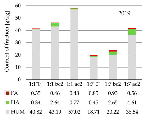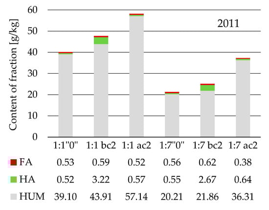 For the determination of humic fractions in the studied soils, tests were carried out to analyze the content of humic substances, namely, fulvic acids (FA), humic acids (HA) and humins (HUM). These tests were conducted for soils that were most contaminated (1:1) and least contaminated (1:7) with metals, as well as for the uncontaminated soil sample, with single and double doses of brown coal and activated carbon (Figure 9 and Figure 10). In these tests, soil samples from 2011 (before setting up the pot experiment) and from 2019 (eight years after adding the brown coal and activated carbon to the pots) were used.