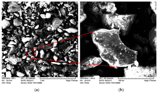 SEM image of the coal waste sample at (a) 100× and (b) 1000× magnification.