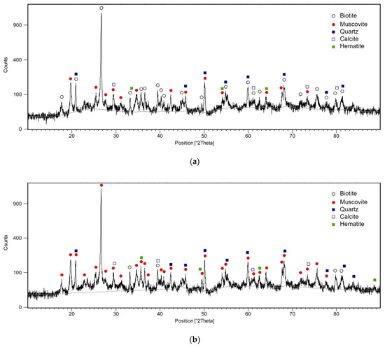 It should be noted that, since the main purpose of this study was to investigate the conditions of the conversion of biotite to muscovite, the presence of other minerals was not studied. Additionally, XRD patterns were analyzed only for the dominant and target phases—namely, biotite and muscovite. However, for the sake of clarity, the XRD results were also quantitatively analyzed and are presented in Table A1.