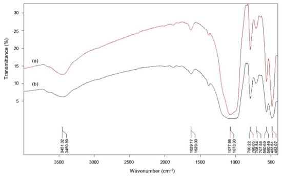 Figure 4a,b exhibits the FTIR spectrum of the starting material and treated product, respectively. Since both samples were mixtures of biotite and muscovite, it was difficult to distinguish the peaks corresponding to each mineral. However, these spectra were similar to those reported in the literature [26,65,66,67,68,69]. The band positions for the starting material and synthesized product are given in Table 4. The hydrous nature was confirmed by the FTIR analysis showing the presence of –O–H bonds at 3451.32 and 3450.89 cm−1 for the starting material and synthesis product, respectively. Further, the Si–O stretching vibrations were observed at 1073.93, 560.46 and 483.61 cm−1 for the product representing the presence of quartz, as can be confirmed by Table A1 and addressed by Marel and Bentelspacher [70] in the literature. Si‒O‒Al stretching vibrations at 707.58 and 560.46 cm−1 correspond to the possibility of the presence of calcite, as given in Table A1. In this context, Gadsen [71] identified a band at 693⋅4 cm−1 for calcite, which is in the range of our findings. At the wavelengths of 1077.86 and 1073.93 cm−1, the peak of the starting material was relatively sharper than that of the synthesized one, most likely due to its higher content of biotite and/or quartz [72]. As can be seen in Table 4, this peak is dedicated to the Si–O stretching vibrations that identify quartz and include 3.9 wt% and 2.7% of the starting and produced materials. In addition, the higher sharpness of the peaks in Figure 4 indicated that the crystals contained in the starting material were more regular than the crystals of the treated sample [73,74]. In this regard, the SEM photographs also showed a clear growth in the dimensions of the muscovite crystals.