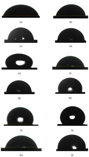 After centrifuging, the coreholders were disassembled to inspect the oil saturation in the core samples. The samples were again loaded in the core holder and the overburden pressure was adjusted prior to placing them in the oven for aging. Once aging was completed, the top (thin) section of the core sample was loaded in a Vinci IFT 700 instrument (Vinci Technologies, Nanterre, France) to measure the contact angle by the sessile drop method using brine as the drop fluid. The measured contact angles for the aged core samples are listed in Table 1. Figure 1 shows representative contact angles for the brine sessile drop in the presence of air for all the core samples. Figure 1a–e are the contact angle measurements for Chalk 1 through Chalk 5 that were aged at increasing time of 1 to 5 weeks. Figure 1f–j are the contact angle measurements of Berea 1 through Berea 5 that were aged at increasing time of 0.5 to 8 weeks. Figure 1k,l are the contact angle measurement for clean and 4 weeks aged Silurian dolomite samples.