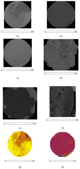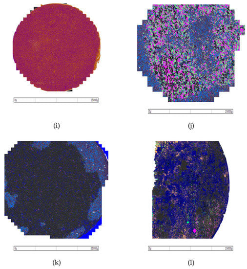 In the second stage, the bottom (thin) section of the aged core sample was utilized for SEM-MLA analysis. FEI Quanta 650 FEG (Brno, Czech Republic) scanning electron microscope, equipped with Bruker high throughput energy dispersive X-ray (EDX) system (Bruker, Billerica, MA, USA) and backscattered electron detectors was used for this purpose. Imaging on the flat sample surfaces was carried out at very low vacuum conditions (79 Pa) to prevent evaporation of fluids. Additionally, the samples were not subject to any metallic or carbon coating on the surface, except for the liquid graphite coating on the sample holder. Instrument conditions and parameters include a high voltage of 25 kV, spot size of 5.75, working distance of 13.5 mm, 10 nA beam current, 16 µs BSE dwell time, 10 pixel minimum size (400 pixel frame resolution for 1 mm HFW) and 12 ms spectrum dwell for EDX. Each of these MLA acquisitions was completed using version 3.1.4.683 MLA™ software and took between 3 and 4 h per sample. Minerals and fluids in the core sample were calculated through a custom classification script that accounted for porosity and minerals. The mineralogy was determined using GXMAP measurement mode within FEI Mineral Liberation AnalyzerTM software, (version 3.1.4.683) equipped on a FEI Quanta 650 Field Emission Gun (FEG) SEM (Brno, Czech Republic). Each mineral identified must be within an 80% match to a known standard x-ray. For the determination of porosity, the “Pores” were determined using a custom classification, in which material that had a greyscale of certain range was scripted to be “Pores” instead of background material. This darker material of “Pores” was not matched to any x-ray standard. The results for individual samples were acquired as digital map of the minerals and a data table listing their mineral composition. Figure 2 is an example of mineral map and BSEM image of a core samples aged for varying time periods at 90 °C. Figure 2a–c are the SEM image of Chalk 1, Chalk 3 and Chalk 5 respectively and Figure 2g–i are the corresponding MLA images. Figure 2d,e are the SEM images of Berea 1 and Berea 5 with Figure 2i,j representing the corresponding MLA images. Figure 2f is the SEM image of Silurian dolomite 2 and Figure 2l is the corresponding MLA image. The minerals identified from the mineral map for chalk samples are listed in Table 4. Wettability assessment was based on the organic (oil) content of the sample in direct comparison to brine and mineral composition prior to saturation. The organic content for each sample is listed in Table 1 as SEM-MLA oil%.