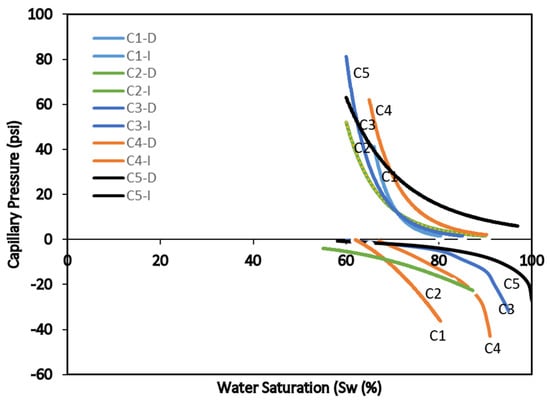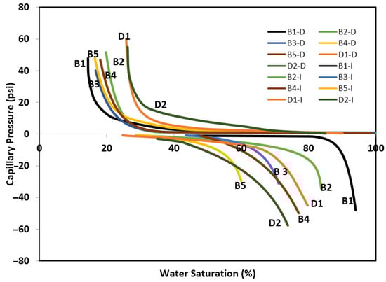 After the primary drainage test was completed, the imbibition step was started to force brine into the aged core sample to displace oil. The core samples were loaded in the core holder (in imbibition mode) with overburden pressure of 6900 kPa (1000 psi). The receiving tubes were filled with the representative brine for each sample and the samples were centrifuged from 500 to 3500 rpm in seven steps of 3 h duration in each step. At the end of the imbibition test, the secondary drainage step was carried out by forcing oil through the brine saturated samples. The secondary drainage process was also carried out in seven steps. The secondary drainage data and the imbibition data were analyzed and the area under each curve was calculated. Figure 3 and Figure 4 are the capillary pressure curves generated for samples saturated with oil at different brine concentration (drainage (D)) and displacement of oil under different brine concentrations (imbibition (I)). The USBM wettability index was calculated based on the area under the curve for both secondary drainage (A1) and primary imbibition (A2) using the formula W = log(A1/A2). The trapezoidal method was used to estimate the area under the curves using the capillary pressure points as the basis for each sample. A sample calculation for area under the capillary pressure curves for dolomite sample is presented in Figure A1 and Table A1 (Appendix A). Typically, the wettability index ranges from >0 for water wet, to <0 for oil wet and 0 for neutrally wet. In comparison with the contact angle measurement, the USBM method provides a macroscopic average of the core plugs used in this study [13,14]. The wettability index calculated via the USBM method for all the core samples are listed in Table 1.