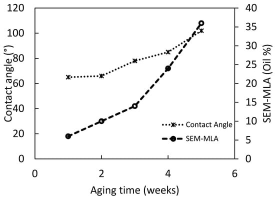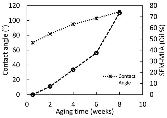 - With increasing aging time, the core samples indicated increasing oil-wet characteristics. Contact angle measurements indicated agreed strongly oil-wet characteristics for increased aging time. Contact angle values varied from 60 (water-wet) to 120° (oil-wet). Above aging time of 4 weeks the contact angle measurements were stable with a contact angle value around 110°.