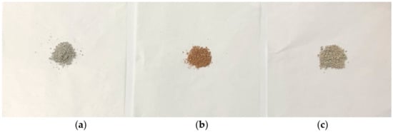 Phosphor powders after calcination. (a) = BAM phosphors; (b) = CAT phosphors; (c) = TRI phosphors. (The size of the weighing paper is 9 cm × 9 cm)