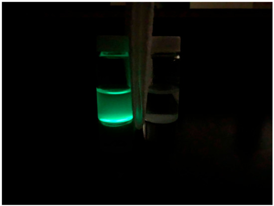 Luminescence of the SRA phosphor before (left) and after (right) acetic acid leaching for 48 h.