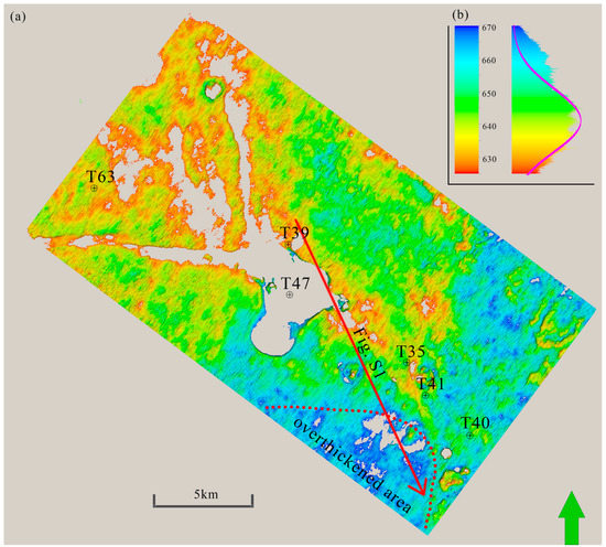- The time difference between T39 and T47 at P-top (Δtp-top) is 58 ms, and the time difference ΔtLM-Btop at LM-Btop is 56 ms (Figure 6b). Comparing T39 and T47, the time thickness difference Δt = Δtp-top − ΔtLM-Btop = 58 − 56 = 2 ms.