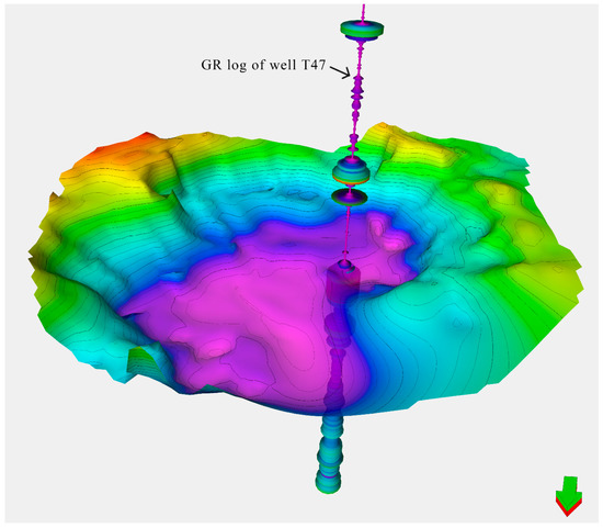 - Select Permian–Triassic boundary (P-top) as top and bioclast limestone top surface (LM-Btop) as bottom. LM-Btop is beneath all seven magmatic layers at the location of T47, and is not affected by the igneous intrusions, thus this layer is used as a reference horizontal surface.