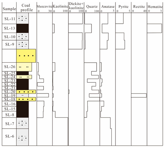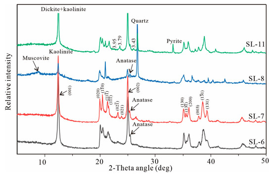 Dickite is a polytype of kaolinite and has the same chemical composition as kaolinite, but they can be distinguished by the XRD pattern. Dickite can be distinguished from kaolinite by the presence of diffraction peaks of 3.95, 3.79, and 3.43 Å (sample SL-11; Figure 4). However, relatively low intensities of 3.95, 3.79, and 3.43 Å appear to indicate a complex of dickite and kaolinite. Thus, this mineral phase is reported as dickite + kaolinite in the XRD results. Most claystone and coal samples have poorly ordered kaolinite (e.g., samples SL-6, SL-8) (Figure 4), indicating a detrital origin [48,49]. However, sample SL-7 immediately adjacent to the coal bench (sample SL-8, Figure 3) shows an increasing kaolinite crystallinity, which is characterized by the weak diffraction of (020) as well as the presence of six diffraction peaks of kaolinite from 20° to 25° (2θ) and from 35° to 40° (2θ), respectively (Figure 4); this relatively well-ordered kaolinite is most likely caused by acidic solutions from the degradation of organic matter, which allow inorganic materials to be degraded and recrystallized.
