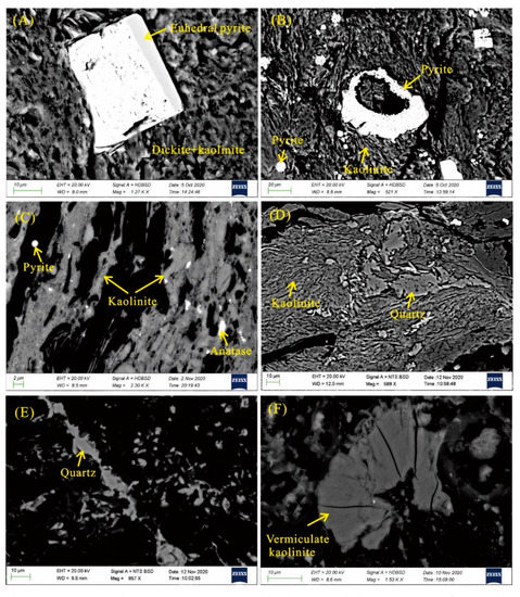 Scanning electron microscope (SEM) back-scattered electron images of minerals (A–F). (A) Euhedral pyrite embedded within dickite matrix (sample SL-9); (B) massive pyrite, framboidal pyrite, and kaolinite matrix (sample SL-9); (C) kaolinite layers and lenses, combined with fine-grained disseminated anatase particles (sample SL-16); (D) kaolinite matrix and quartz-filled cavities (sample SL-13); (E) fracture-filled quartz (sample SL-16); (F) vermiculate kaolinite (sample SL-25).