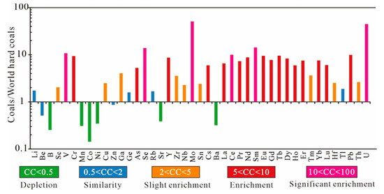 Concentration coefficient (CC) of trace elements in the studied coals, normalized to the respective average of world hard coals [28].
