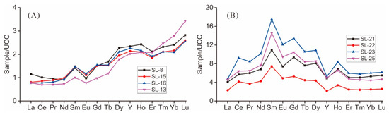 A threefold geochemical classification (LREY, MREY, and HREY) and the three enrichment types (L-type, M-type, and H-type) of REY proposed by Seredin and Dai [7] as well as the upper continental crust [52]–normalized REY pattern were used in the present study to monitor the fractionation among REY. The Upper Continental Crust (UCC)–normalized REY patterns show an H-type REY distribution pattern in coal benches SL-8, SL-15, SL-16, and SL-13 (Figure 7A) and an M-type REY pattern in coal benches SL-21, SL-22, SL-23, and SL-25 (Figure 7B), possibly indicating the influence of aqueous solutions [5,53]. The coal samples exhibit slightly negative Eu anomalies (Figure 7A,B), indicating contributions from felsic compositions [53]. The coal benches showing an H-type REY pattern display essentially no Ce anomalies (Figure 7A) while coal benches showing an M-type REY pattern exhibit slightly positive Ce anomalies (Figure 7B).
