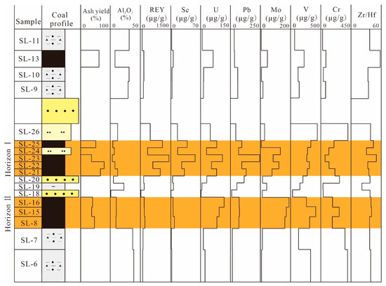 In Horizon I, U, Se, and Pb significantly positively correlate with each other, possibly reflecting that they have the same carrier; however, they show essentially no correlations with S and Fe2O3 but strongly negative correlations with ash yield (Figure 9), apparently pointing to an organic association. As reported above, the U–Se–Pb-bearing solutions, which are leached from the host rocks and partings, flow and ultimately precipitate into coal benches due to the reduction of organic matter during coalification. This process can better explain why the U-enrichment horizons are closely adjacent to the host rocks and parting throughout the outcrop profile (Figure 9). By contrast, the distribution of Mo differs from that of U, Se, and Pb, indicating various carriers; Mo is positively correlated with Fe2O3 (r = 0.90), appearing to indicate that the Fe-sulfides are the major host of Mo. Fe-sulfides (e.g., pyrite) predominantly occur as euhedral crystals, indicating a syngenetic origin. Thus, Mo involved within pyrite is most likely hosted during peat accumulation or the early diagenetic stage under anoxic conditions. The contents of V and Cr are strikingly higher in the host rocks (samples SL-26 and SL-20) compared to that in the coal benches in Horizon I, suggesting a detrital input, which is consistent with the previous studies [56].