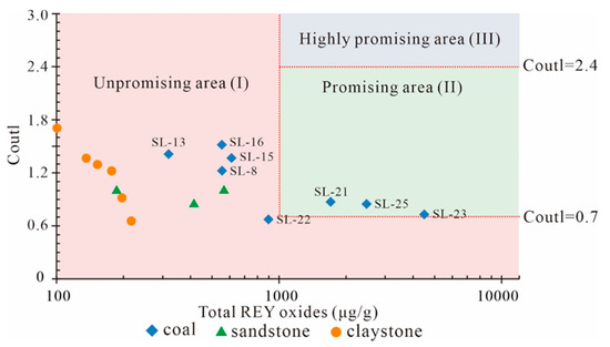 Total REY contents and individual REY compositions in coals are important for evaluating the economic recovery of REY. Seredin and Dai [7] proposed that the cutoff grade of REY oxides (REO) in coal ashes is 1000 μg/g. For REY-rich coal ashes, the outlook coefficient (Coutl) was used to determine the economic potential of REY, and its calculation follows Equation (1), with >2.4, 0.7–2.4, and <0.7 indicative of highly promising, promising, and unpromising REY raw materials, respectively [1,7,16]. Moreover, the Coutl-REO graph was also utilized to evaluate the REY economic potential [15].