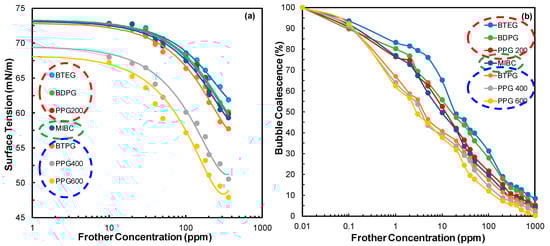 - Karakashev, S.I.; Grozev, N.A.; Batjargal, K.; Guven, O.; Ozdemir, O.; Boylu, F.; Çelik, M.S. Correlations for easy calculation of the critical coalescence concentration (CCC) of simple frothers. Coatings 2020, 10, 612. [Google Scholar] [CrossRef]