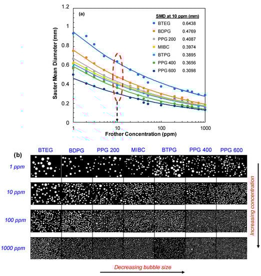 - Gupta, A.K.; Banerjee, P.K.; Mishra, A. Effect of frothers on foamability, foam stability, and bubble size. Coal Prep. 2007, 27, 107–125. [Google Scholar] [CrossRef]