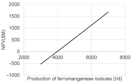 Because the revenues from FN shown in Table 7 have larger effects on economy, sensitivity analyses using the FN production rate are examined. In the analyses, the production of REE-rich mud is fixed as 6000 t/d and the one for FN is increased from 3000 to 7000 t/d. In each of the analyses, CAPEX, OPEX, and the income are recalculated. The results of the NPV are summarized in Figure 1. About 4000 t/d is found as the point of NPV = 0.