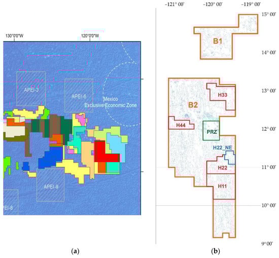 Exploration and exploitable blocks included in the IOM resource estimation (b), related to the International Seabed Authority exploration areas for polymetallic nodules (a) (source: www.isa.org.jm; accessed on 7 January 2021).