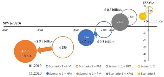 The loss of revenue from the sale of manganese and cobalt caused a significant decrease in the profitability of the project, regardless of the considered scenario and technological variant. Neither option achieved a rate of return justifying the start of the project. For both scenarios, the project did not bring an increase in value (positive NPV). In the worst-case scenario (PM technology) the decrease in discounted NPV reached USD 2 billion (Table 13, Figure 12).