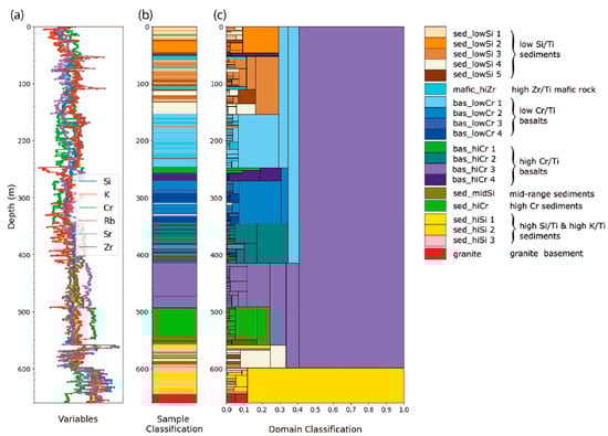 A domain classification pseudolog that is most similar to the rock-block stratigraphy defined from the whole-rock geochemical data occurs at a domain scale of 20 at domain scale 20 (Figure 7c,d, also see Figure 2b). This domain scale captures the boundaries of some slabs that are well defined from domain scales of 0 to ~80 (e.g., boundaries of slabs 7, 8 and 9). However, at domain scales higher than 30 the mosaic plot starts to show classifications that are not related to the composition and distribution (spacing) of the slabs (Figure 7d). Conversely, some classifications at domain scale 20 and lower show more variations than are observed in the rock-block stratigraphy (intradomain classifications), which may be attributed to smaller scale features of individual rock slabs (e.g., mineralogical variation).