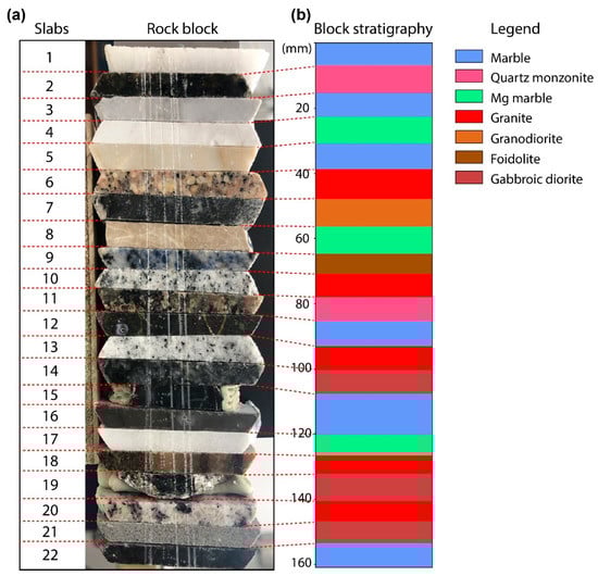 Rock block assembled for this study. (a) Rock block of approximately 16 cm length, composed of 22 distinct rock slabs; (b) lithogeochemical log of the rock block. Lithologies assigned according to CaO-MgO-Fe2O3 (for marbles) and total alkali versus silica (for igneous plutonic rocks) discrimination diagrams and using whole-rock geochemical data.