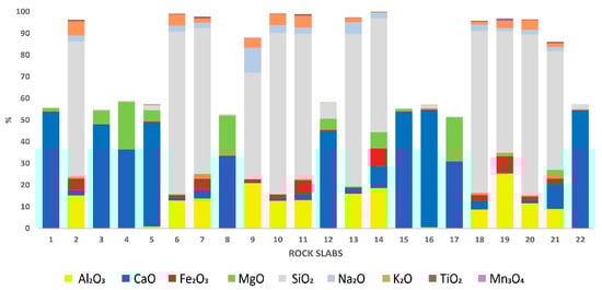 Results of whole-rock geochemical analysis for the 22 rock slabs in oxides. Samples dominated by CaO (blue colour) are marbles. Samples dominated by SiO2 (grey colour) are plutonic rocks (mainly granitoids). Detail on rock slab lithology is given in Figure 4. (Note: Loss on ignition (LOI) is not reported here. It is expected that carbonate-dominated samples will have high LOI (~40–50%) due to CO2 generation during heating.