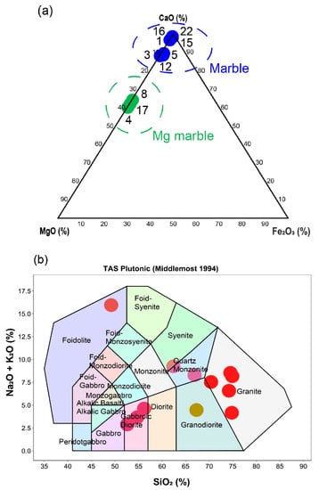 Lithological classification of marble and plutonic slabs based on laboratory whole rock geochemical data. (a) CaO-MgO-Fe2O3 ternary diagram used to classify marble slabs. (b) Total alkali versus silica diagram (TAS) [32] used to classify the plutonic rocks. Numbers shown next to sample points correspond to the rock slab number shown in Figure 2a. Sample colours legend is shown in Figure 2c.