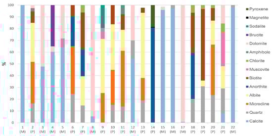 It is important to clarify that as conventional XRD is a semiquantitative technique that these mineral abundances should be considered as semiquantitative with errors of ±3%. There are also inherent complexities in the quantification of mica minerals (muscovite, chlorite, and biotite) which results in overestimation due to the preferred orientation effects. This preferred orientation is a common effect for minerals that have platy crystallites when the sample is prepared using the back-packed technique for conventional XRD analysis.