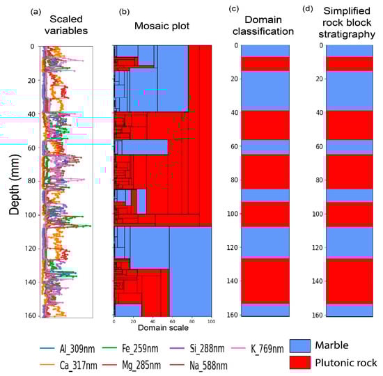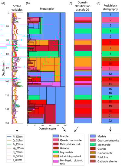 At domain scales from 0 to ~15, a pseudolog showing only the domain classification boundaries from the mosaic plot matches well with the geological log (compare Figure 6c to Figure 6d). In this domain classification pseudolog, the blue blocks correspond to areas of chemistry dominated by Ca and Mg, and the lack of variation in chemistry across individual slabs is evidenced by the relatively few boundaries detected by the wavelet tessellation in those regions (Figure 6b). The blue regions match well with the marble in the rock slab stratigraphy and are therefore able to be labelled as such (Figure 6c,d). Within the red blocks in the pseudolog, the chemistry is highly variable, and this is reflected in the many small-scale boundaries detected by the wavelet tessellation in those region (Figure 6b). These blocks match well with the plutonic slabs in the rock slab stratigraphy and are therefore labelled plutonic rocks (Figure 6c,d).