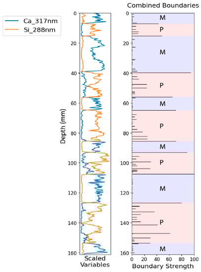 Ca (317 nm) and Si (288 nm) LIBS data combined boundaries generated through wavelet tessellation. Note that superimposed sharp variations on Ca and Si counts are related to the strongest boundaries (multivariate boundaries) and the presence of intraslab boundaries suggests the possibility of refined classifications, mainly relative to plutonic slabs. (M = marble, P = plutonic; classification from whole rock geochemistry data, Figure 4).
