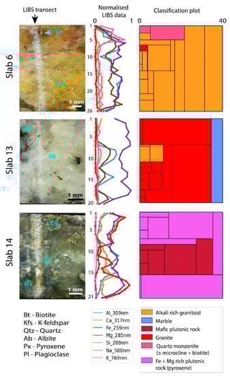 Linking the densely spaced LIBS signal at lower domain classification with mineralogical (XRD) data can be used to provide indirect information about rock texture, namely grain size. For instance, slab 14 has a dominantly bimodal mineralogy comprising plagioclase (81%) and pyroxene (19%), both of which can be seen in the hand specimen (Figure 9). Pyroxene-dominated regions are classified as Fe + Mg rich plutonic rock over two continuous intervals that correspond to ~2.8 mm (eight LIBS spots) and ~2.35 mm (seven LIBS spots) length (Figure 9). These measurements may be considered indicative of the size of the grains. Applying the same logic to slab 6 it is possible to infer that K-feldspar crystal analysed along the transect in that rock can be as big as 5.6 mm (16 LIBS spots). In slab 13, quartz grains can reach at least 2.35 mm and albite grains 1.05 mm (Figure 9).