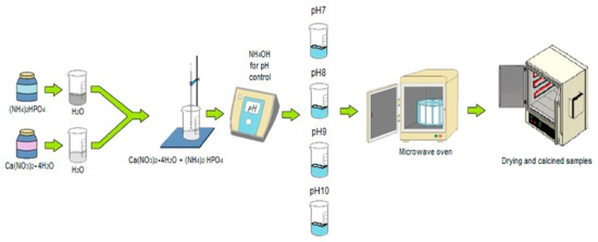 Schematic experimental protocol used to prepare synthetic HAp. The pH of the aqueous precursors’ solutions was adjusted prior to performing the chemical reaction inside the microwave oven.
