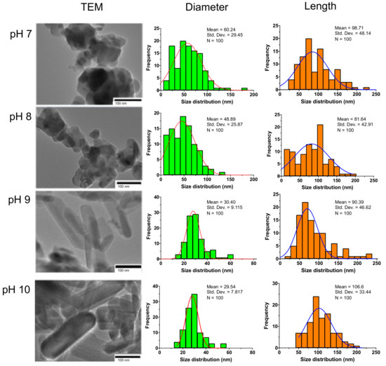 The diameter and length size distribution histograms (middle and right columns) were built considering ca. 100 manual measurements. The average sizes (or mean) ± standard derivations are reported in Figure 2 and summarized in Table 2. Therefore, the HAp sample prepared at initial pH = 7 contains particles with an average diameter of 60.24 nm and an average length of 98.71 nm. At this condition, the presence of sub-hedral particles was confirmed. In the sample at pH = 8, particles with an average diameter of 48.89 nm and a length of about 81.64 nm are observed. On the other hand, at pH = 9 nanorods with a length/diameter (L/D) aspect ratio close to 2.973 (higher than the circularity value of 1.0, L = D) were formed, and it was notably observed that their radial dimension decreases by increasing the pH. Thus, the sample obtained at a pH value of 10, shows thinner nanorods with a diameter of 29.54 nm and length of approximately 106.6 nm (L/D = 3.608).