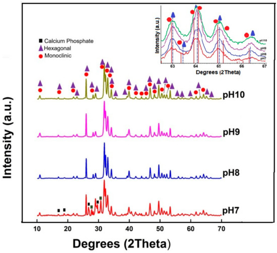 X-ray diffractograms of the HAp nanopowders synthesized at different initial pH conditions showing the presence of the calcium phosphate (■), hexagonal (▲) and monoclinic (●) HAp phases for the sample synthesized at pH = 7. Samples synthesized at pH 8, 9, and 10 showed only the presence of the monoclinic and hexagonal HAp phases. Insert: magnified region, from 62.5° to 67.0°, to appreciate the individual diffraction peaks of the monoclinic and hexagonal HAp crystalline phases.