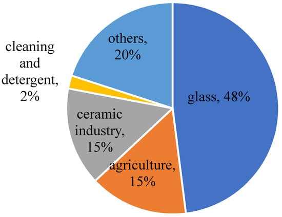 BMs have been used in various applications dating from the eighth century when applied in the refining and assaying of gold and silver [8]. They have been used in several other applications such as medicines, food preservatives, ceramic glazes, and metal fluxes [9]. The modern applications of BMs and boron derivatives include microbicides, insecticides, wood treatment agents, washing products (e.g., detergents and soaps), special alloys, fertilizers, fire retardants, fiberglass, and heat resistant glass (e.g., Pyrex) [10,11,12,13]. BMs also can be used in the metallurgical industries [2,14]. Boron compounds have a considerable potential to be used in the energy sector where “B” as a hydrogen carrier in the form of BH4, has a higher hydrogen storage capacity than other hydrides and compounds; hence, it can be used as a hydrogen carrier. However, it was reported that the glass, ceramics, and agricultural sectors consume about 80% of refined borates and boric acid produced in the world (Figure 1) [15].