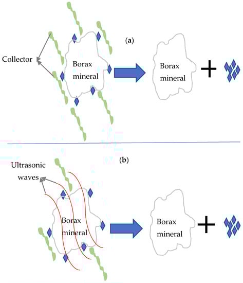 Ultrasound is a cost-effective and environmentally friendly pretreatment method that can disperse clay minerals before removing them and decreasing their BM coating rate [20,21,39]. The attachment of clay minerals on the surface of colemanite particles is a significant factor for decreasing their flotation efficiency. Hence, a series of flotation experiments have been conducted to determine ultrasonic treatment’s ability in dispersing clays from the colemanite surface [11]. Celik et al. reported that flotation could recover 5% of colemanite without ultrasonic pretreatment, while over 90% of the ultrasonically treated sample could be recovered by flotation separation [11]. In-situ ultrasound treatment detaches clay particles from the colemanite surfaces and increases anionic collector adsorption rate on their surfaces [6]. In other words, ultrasonic pretreatment improves reagents’ effectiveness due to the improvement of their uniform distributions and activities in the suspension (Table 1) [40,41,42,43]. It was also reported that conditioning through in-situ sonication requires a lower collector addition (several times lower than the prepared sample by conventional conditioning); hence, it serves as a cheaper separation method [11] (Figure 2). The shearing forces of ultrasound waves are therefore responsible for the reduction in the quantity of collectors/reagents used.