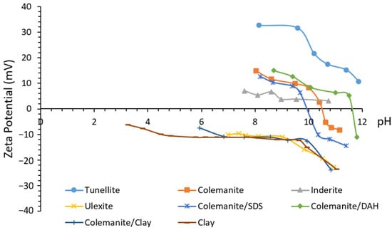 Zeta potential (ζ) and isoelectric points (IEPs) for a series of BMs in water and when conditioned with reagents have been reported. For instance, colemanite exhibits IEP at a pH of around 10.5 in distilled water (Figure 3) [2,19,26]. Inderite (magnesium borate) and tunellite (strontium borate) show positive ζ potentials with no clear IEP throughout the pH range 7 to 11 [25]. Similarly, ulexite [2,25] and borax [17] exhibit no IEP down to about pH 7 but possess negative ζ potentials.