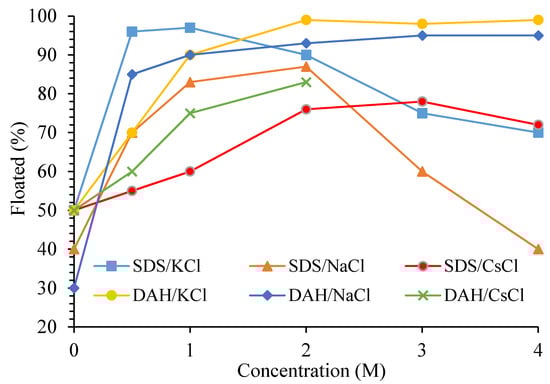 BMs contain monovalent salts in their lattice structure (for instance, sodium being the prominent one in borax). Monovalent ions compress the double layers of minerals and change the surface activity for collector adsorption by modifying the bulk water structure and micellization of collectors. Some investigations showed that monovalent cations and anions change the bulk structure of water and transport the same operation to the surface, depending on their water-breaking and water-making structures. It was also stressed that monovalent ions are adsorbed at the solid surfaces and interact with water [5]. The mechanism of BM flotation was investigated using the chlorides of monovalent ions Na+, K+, and Cs+ in the presence of SDS and DAH surfactants. NaCl and KCl can be structure makers or breakers, while CsCl is a potent structure breaker [28,48]. High dosages of these monovalent salts (≥0.1 M) make electrostatic interactions ineffective (Figure 5) [2,6,49].