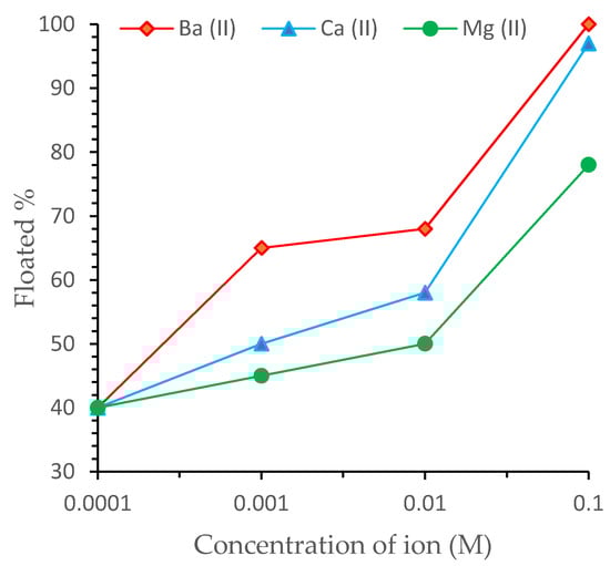 Multivalent ions, especially Ca2+, can play different roles in BMs’ flotation separation [26,29]. In the presence of SDS, three areas characterized the reaction of colemanite with cations: (1) the adsorption of divalent ions onto the surface of colemanite; (2) the adsorption of an anionic surfactant on the surface; and (3) the bulk precipitation of metal dodecyl sulfate onto the surface of colemanite (surface precipitation occurs before bulk precipitation) [50]. Relative to their solubility, multivalent ions react with collectors; for instance, with dodecyl sulfate (DS), the product strengths of collector salts show the following order Ba(DS)2 < Ca(DS)2 < Mg(DS)2 [26]. As Figure 6 showed, the least soluble Ba(DS)2 activates colemanite most; the most soluble Mg(DS)2 activates it the least. It was also reported that Ca(DS)2 unavoidably precipitates at a high salt concentration [6,51]. Flotation experiments on colemanite samples from Emet mines in Turkey indicated that increasing Ca2+ and Mg2+ ion concentrations from 0 to 300 ppm reduced B2O3% recovery values from 99–65% for combined usage of Ca and Mg ions. The addition of these ions increased the tailings grade values by 18–25% [52].
