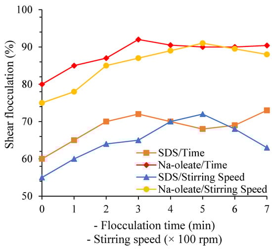 Stirring speed and flocculation time are critical parameters in the flocculation of colemanite. An optimized stirring speed ruptures the flocs while stirring rates below their optimum value may reduce particles’ collision efficiency in the suspension and reduce the suspension’s BMs’ flocculation. Studies showed that a stirring speed of 500 rpm and conditioning for 3 min affects the highest degree of flocculation with sodium oleate and SDS (Figure 7). Shear flocculation, a slow process [54], has shown high flocculation degrees at low flocculation times for some minerals. There was no significant decrease resulting from a floc rupturing process at flocculation times above the 3 min when colemanite is aggregated in a suspension treated with oleate and SDS. Therefore, 3 min proved to be sufficient time for colemanite flocculation. Flocculation time depends on the surface charge, the particle size, the particle concentration, and electric charges on the surface generate kinetic energy barrier [52,55]. Overcoming this barrier requires appropriate stirring strength. Decreasing the surface charge decreases the critical shear rate needed for shear flocculation of minerals. A high surface charge requires prolonged flocculation time, while a low charge may cause a rapid agglomeration. In general, coarser particles require lower rates than finer particles [52,54,55].