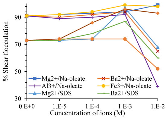 Multivalent ions have been studied for their effects on colemanite shear flocculation (Figure 8). Multivalent ions such as Mg2+, Ba2+, and Fe3+ enhance BMs’ flocculation as a function of pH [13]. They reduce the BMs’ negative surface charge and enhance their coagulation in the suspension [39,58,59]. Celik et al. [11] indicated that barium ion is more effective in colemanite flocculation than magnesium ion. The difference in their product solubility with SDS was suggested as the main reason [11]. However, significant decreases in colemanite flocculation were observed at concentrations higher than these ranges [13]. In the presence of multivalent ions, the maximum degrees of colemanite flocculation was reached at pH between 9–11.5 [11,13].