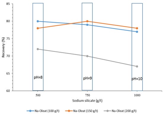 Calcite serves as a hindrance to the selective flotation of borax. Therefore, sodium silicate was used to depress borax. The sodium oleate’s maximum chemisorbed on the calcite surface can occur at pH ranges 10–11 [66,67]. Though, Çilek and Üresin showed that sodium oleate dosage is the essential variable affecting both the grade and recovery of BMs in the concentrate (Figure 9) [40].