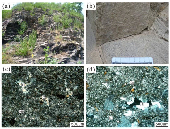 Representative meso- and micro-fabrics of Early Jurassic volcanic rocks. (a) Field outcrops of trachyticdacite. (b) Field outcrop of hornblende trachydacite (hornblende directional arrangement). (c) Trachyte amphibolite dacite (YX-06). (d) Rhyolite (YX-07). Note: Bi—Biotite; Hb—Hornblende; Pl—Plagioclase; Q—Quartz.