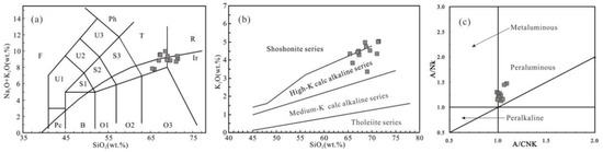 Twelve typical fresh Early Jurassic intermediate-acidic volcanic rocks were selected for geochemical analysis, and the results are shown in Table 2 and Table 3. The SiO2 in volcanic rocks is 60.70~71.45 wt.%, which is a set of intermediate-acidic magmatic rocks. The volcanic rocks contain Mg# [Mg# = 100 Mg2+/(Mg2+ + TFe2+)] values of 16–48, 0.23–0.77 wt.% TiO2, 2.05–6.14 wt.% TFeO, 14.23–16.81 wt.% Al2O3, 0.63–4.21 wt.% CaO, 3.46–6.01 wt.% Na2O, 3.35–5.85 wt.% K2O, 0.79–1.79 Na2O/K2O, and (Na2O + K2O) concentrations of 7.79–11.28 wt.% (Table 2). In the total-alkali vs. silica (TAS) diagram (Figure 5a), they fall into trachyte and rhyolite areas respectively (the normative Quartz more than 20 wt.% in most samples). In the SiO2 vs. K2O diagram (Figure 5b), the samples mainly fall into the area of high-K calc-alkaline series, and a small amount falls into the area of the shoshonite series. They have A/CNK values of 0.99–1.09, indicating they are metaluminous to weakly peraluminous (Figure 5c).