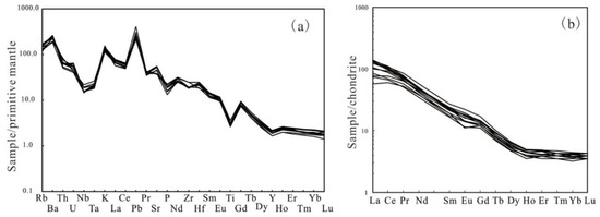 Primitive mantle normalized trace element spidergrams (a), after Sun and McDonough [66]) and chondrite normalized rare earth element (REE) patterns (b), after Boynton [67]) of the Early Jurassic volcanic rocks.