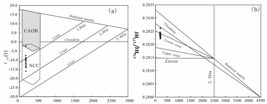 Zircon Hf isotopic characteristics of Early Jurassic volcanic rocks in the geological corridor of western Liaoning (a), after Yang et al. [68]; (b), after Wu et al. [69]). CAOB = Central Asian Orogenic Belt; NCC = North China Craton.