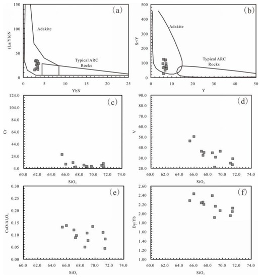 Discriminant diagram of adakite rocks and SiO2 concordant diagram. (a) (La/Yb)N-YbN diagram; (b) Sr/Y-Y diagram; (c) Cr vs. SiO2 diagram; (d) V vs. SiO2 diagram; (e) Cao/Al2O3 vs. SiO2 diagram. (f) Dy/Yb vs. SiO2 diagram.